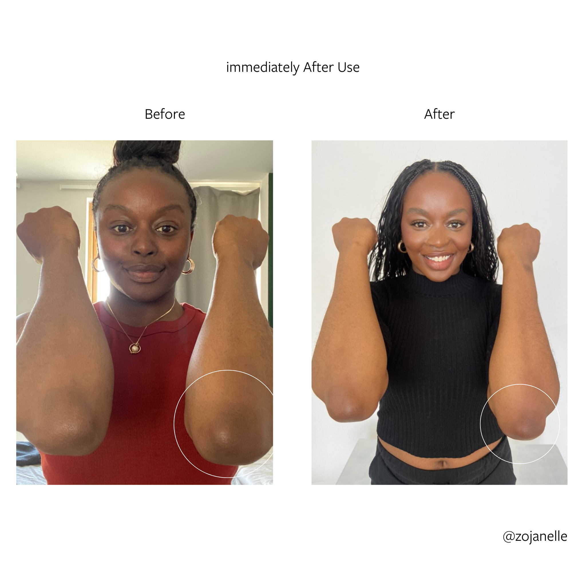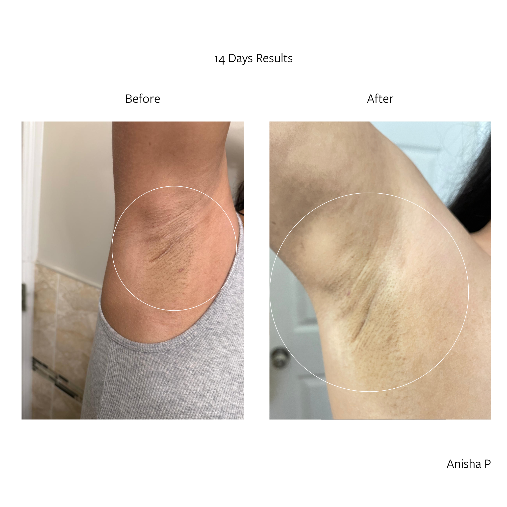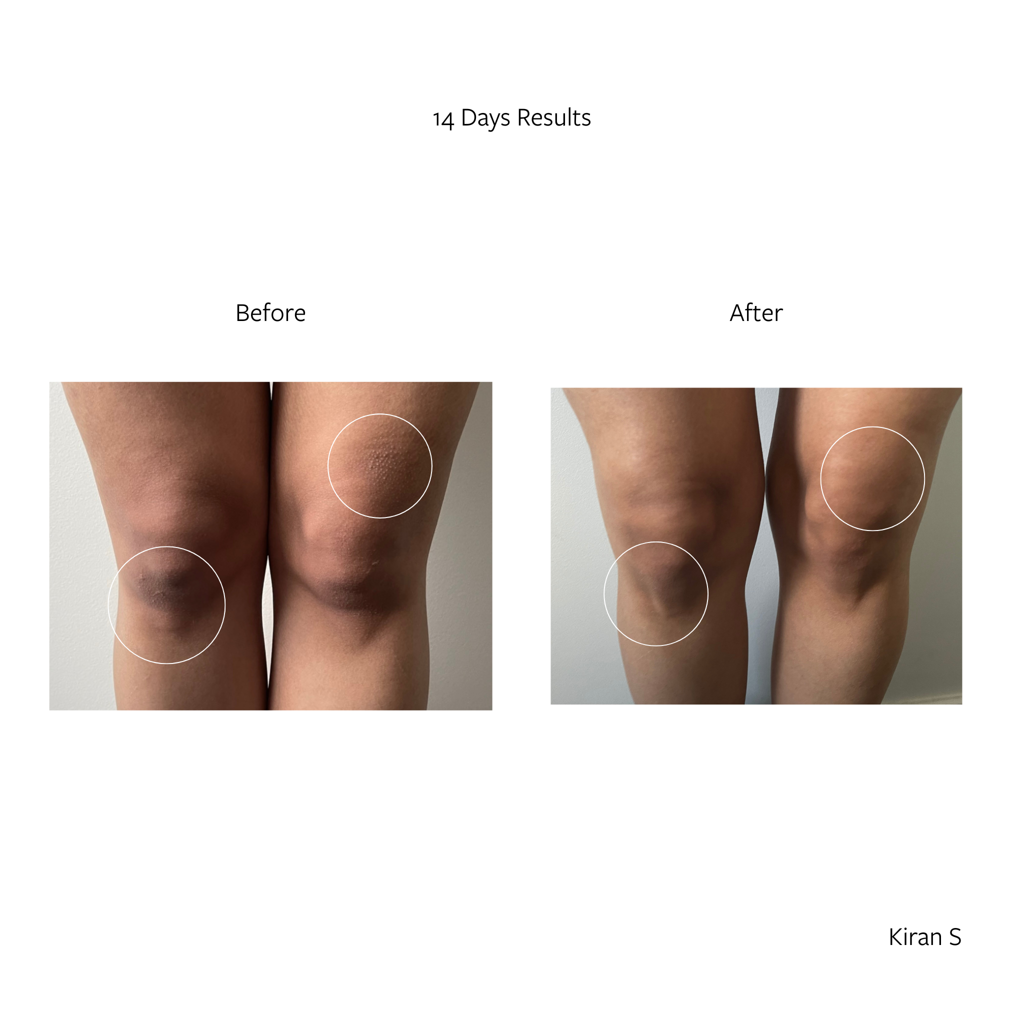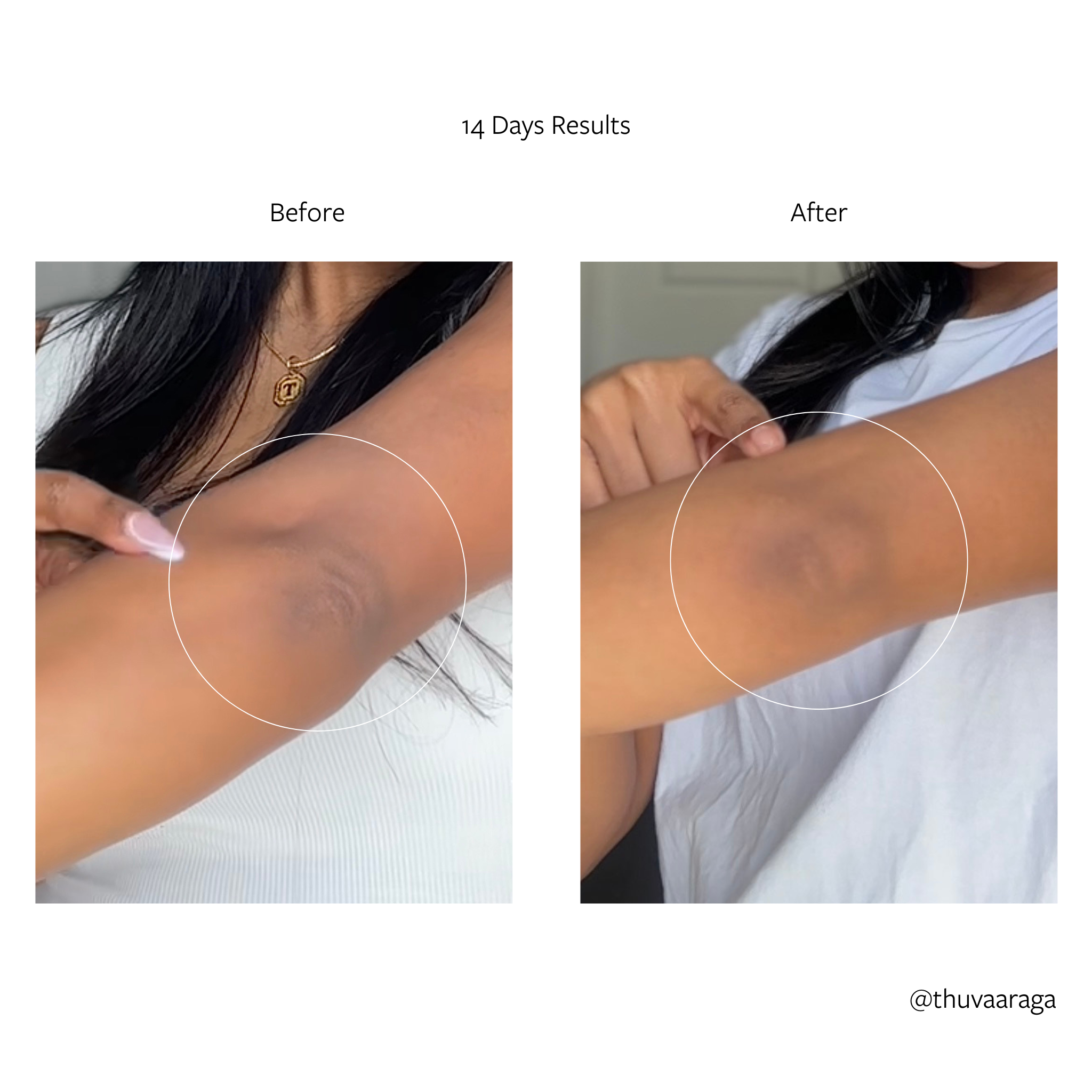 "This gave an instant brightening look to my elbows and the consistency was very light weight but felt so hydrating! No irritation at all. These are my 14 day results. Tried to take it in same exact lighting too so i can compare more accurately and didn’t realize it made such a difference until these pictures!"